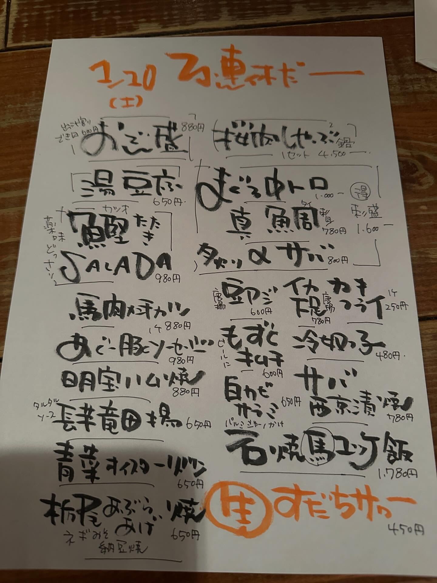 メニュー2026年1月6日お魚さん あり〼 馬刺しもあり〼